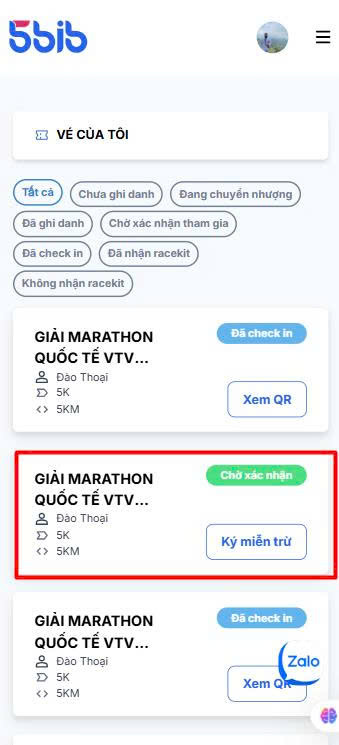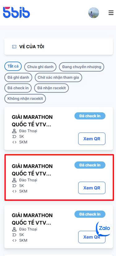 Bước 11: Bấm chọn vé vừa ký miễn trừ xong [xem QR] và gửi mã QR cho người được ủy quyền, đến tại sự kiện để nhận racekit