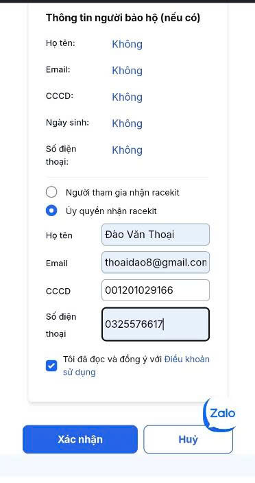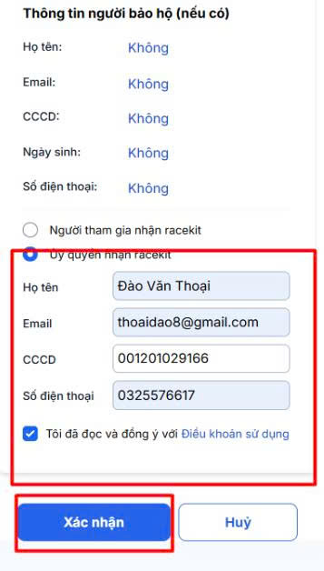 Bước 8 Kiểm tra lại thông tin đăng ký và bấm chọn [ủy quyền nhận racekit] điền đầy đủ thông tin người nhận ủy quyền racekit sau đó bấm xác nhận